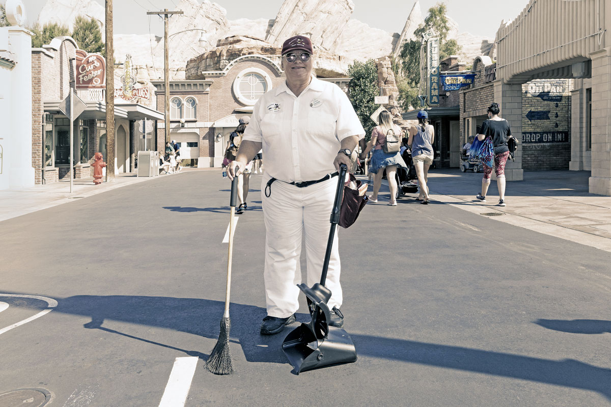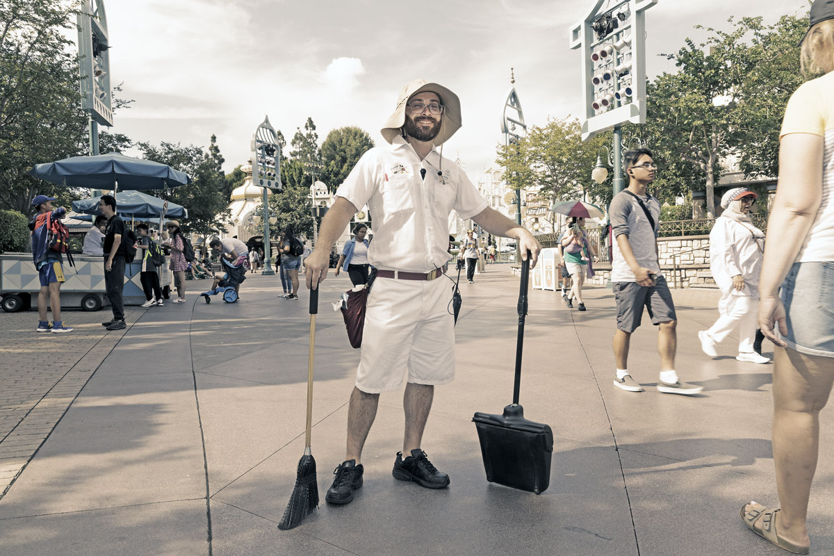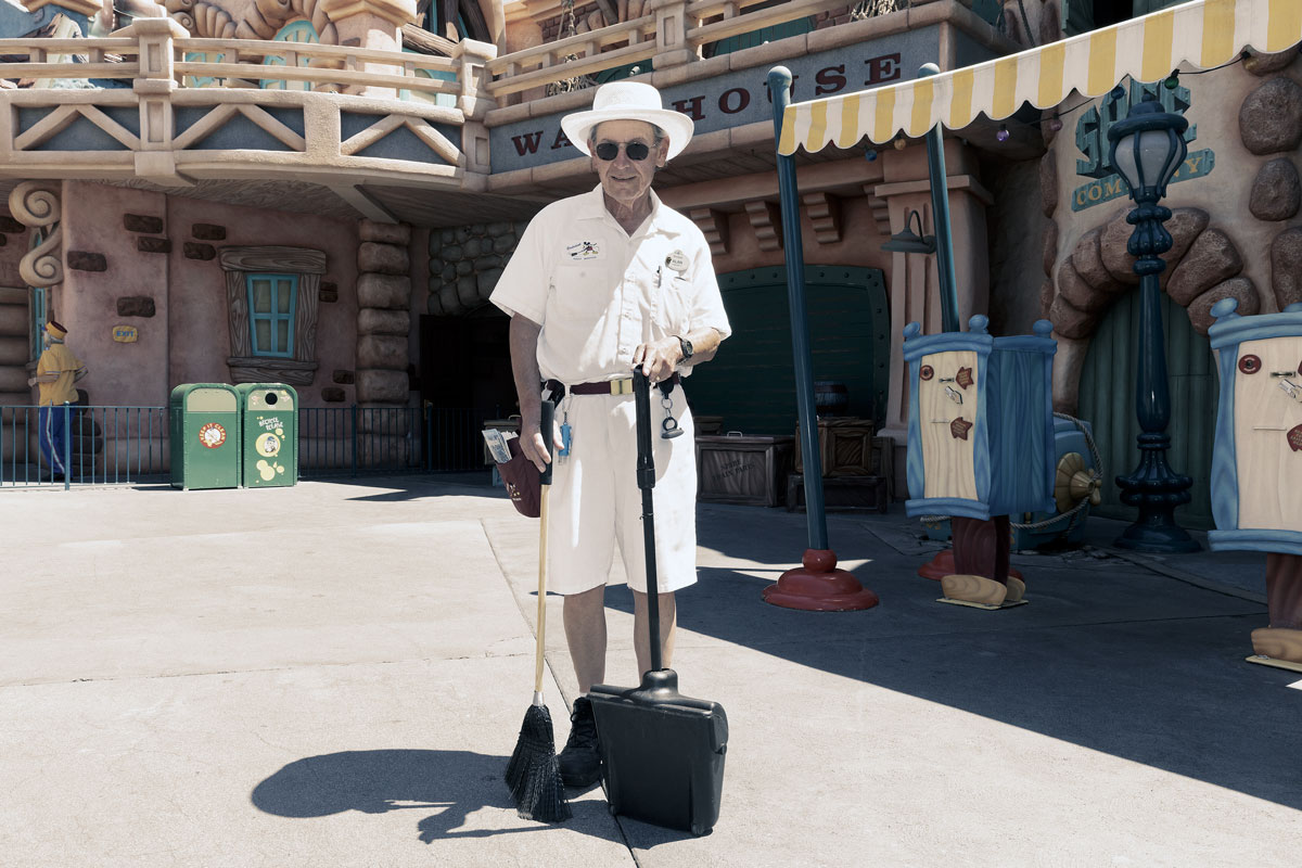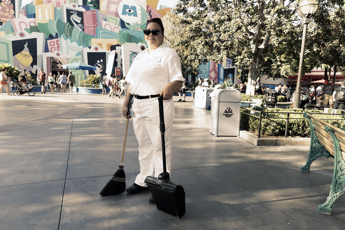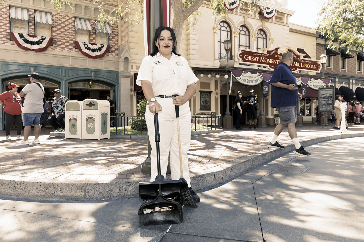 Shortly after entering Disneyland, I noticed the first cleaning lady in her bright white outfit. I approached her and, like everyone else I approached, she was completely relaxed to be photographed. Many felt touched and were happy for the attention they were given. All wore a tag with their first name and place of birth.