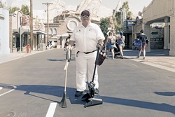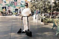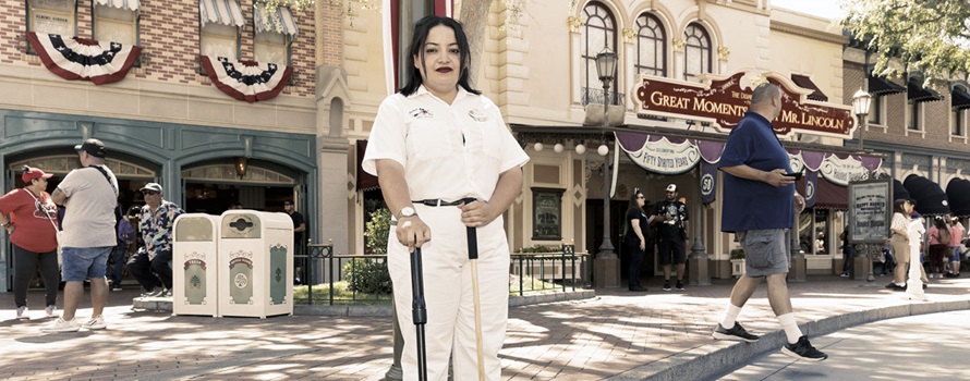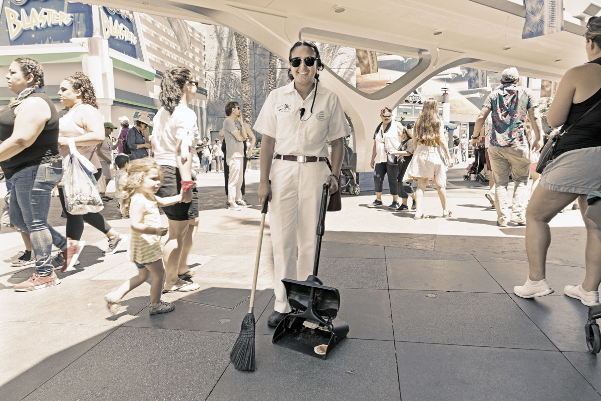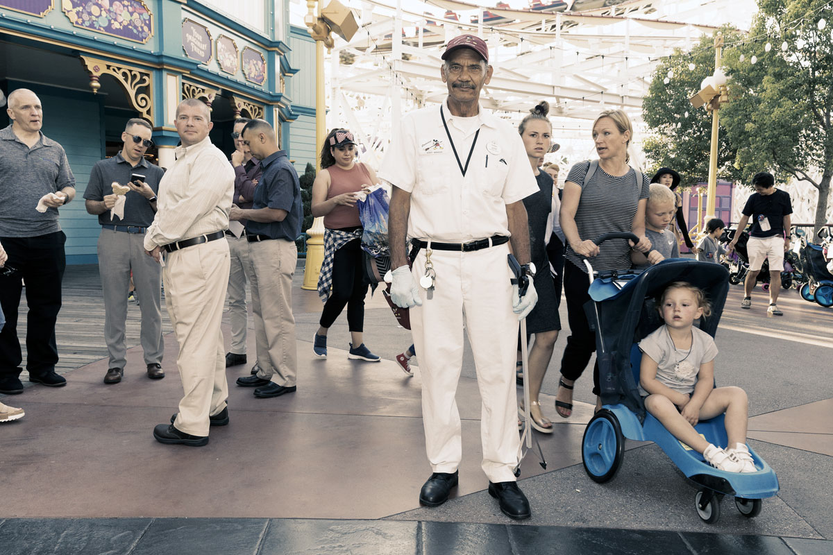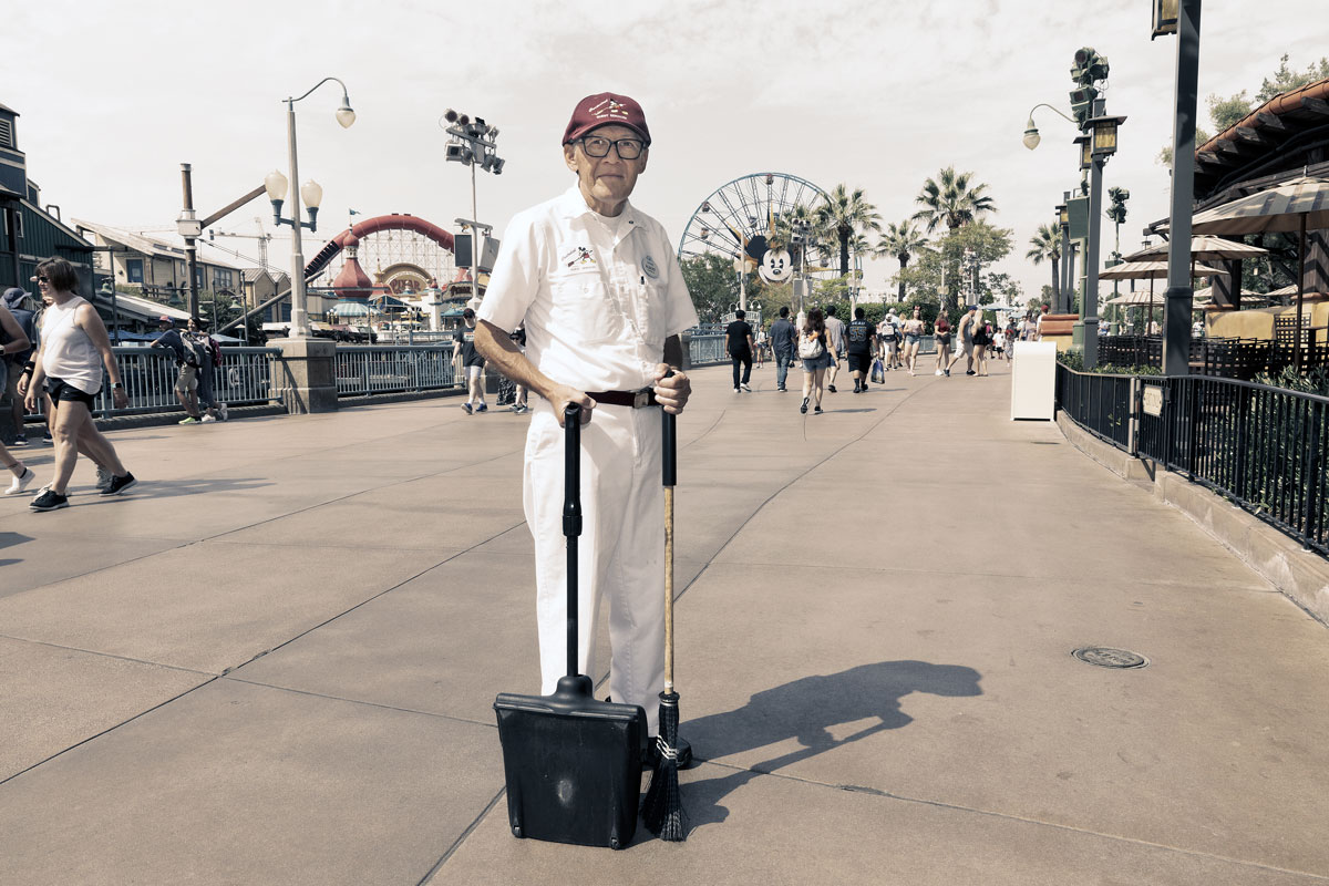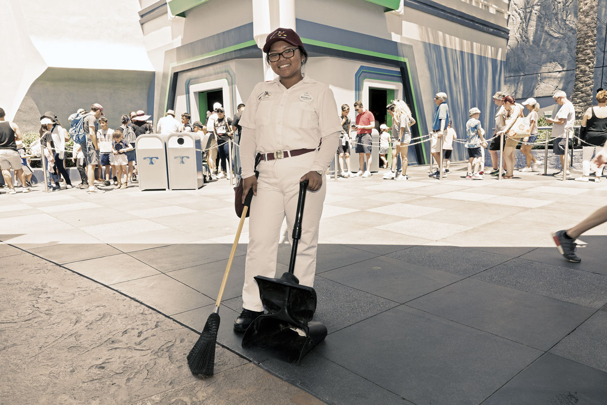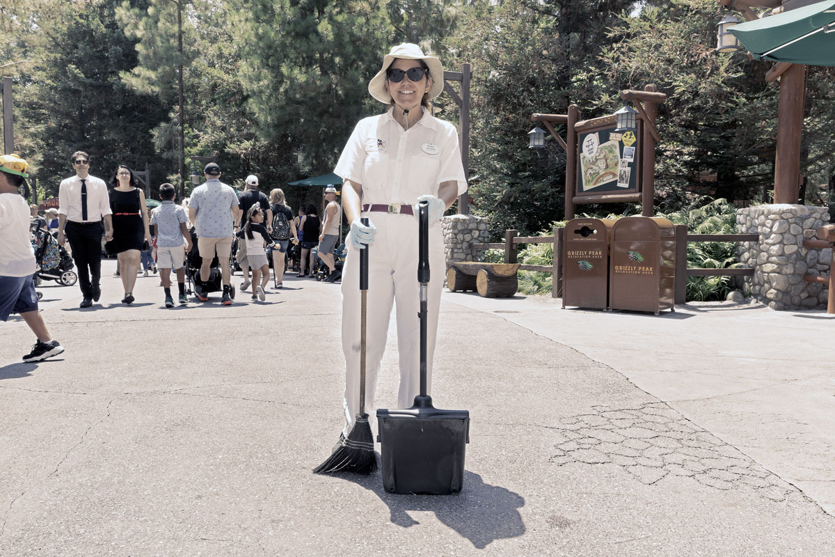 Shortly after entering Disneyland, I noticed the first cleaning lady in her bright white outfit. I approached her and, like everyone else I approached, she was completely relaxed to be photographed. Many felt touched and were happy for the attention they were given. All wore a tag with their first name and place of birth.
